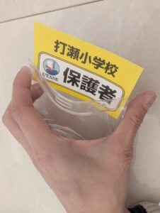 ネックストラップの銀色のクリップ部分の模様がある方が【オモテ】「保護者」の面にくるように、クリップをSTEP3で開けた穴にセットします。